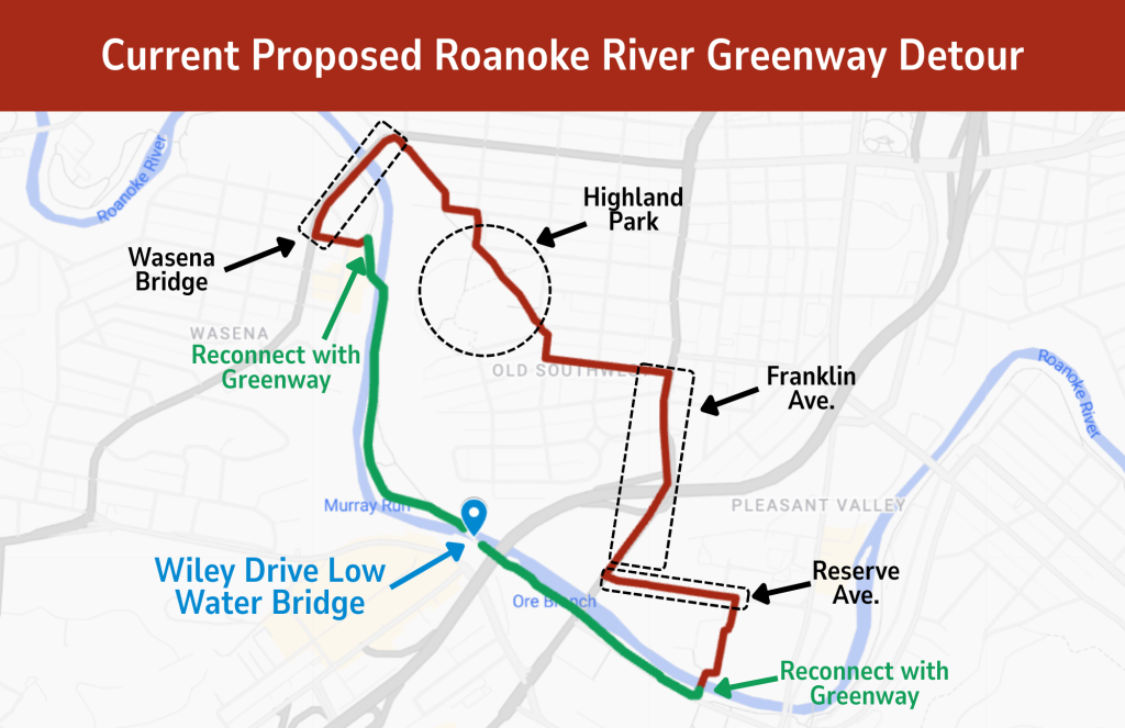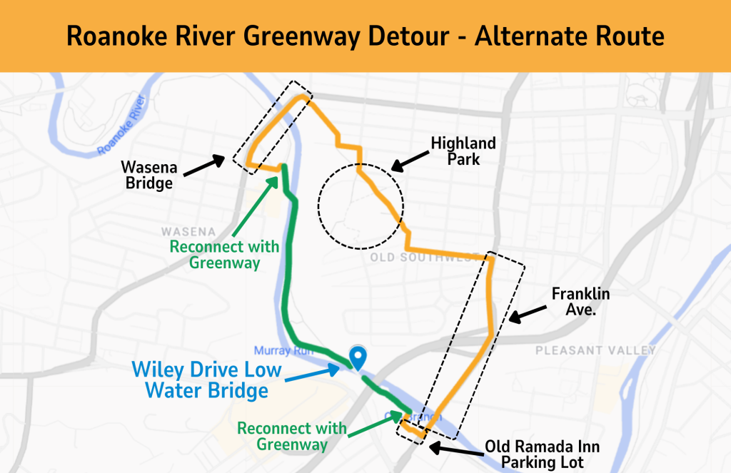 - Greenway detour during construction: The city has stated that “a signed detour will direct Greenway users to cross the Wasena Bridge, travel through Highland Park, connect with Franklin Rd at Walnut, and cross at Reserve to reconnect with the Roanoke River Greenway in Rivers Edge Park”
