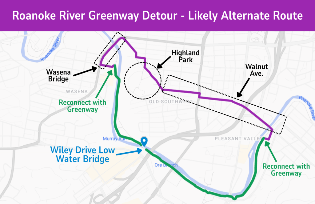 - Provide an additional signed detour route along Walnut Ave to the Roanoke River Greenway near Blue Cow Ice Cream for users traveling towards Riverland and Bennington